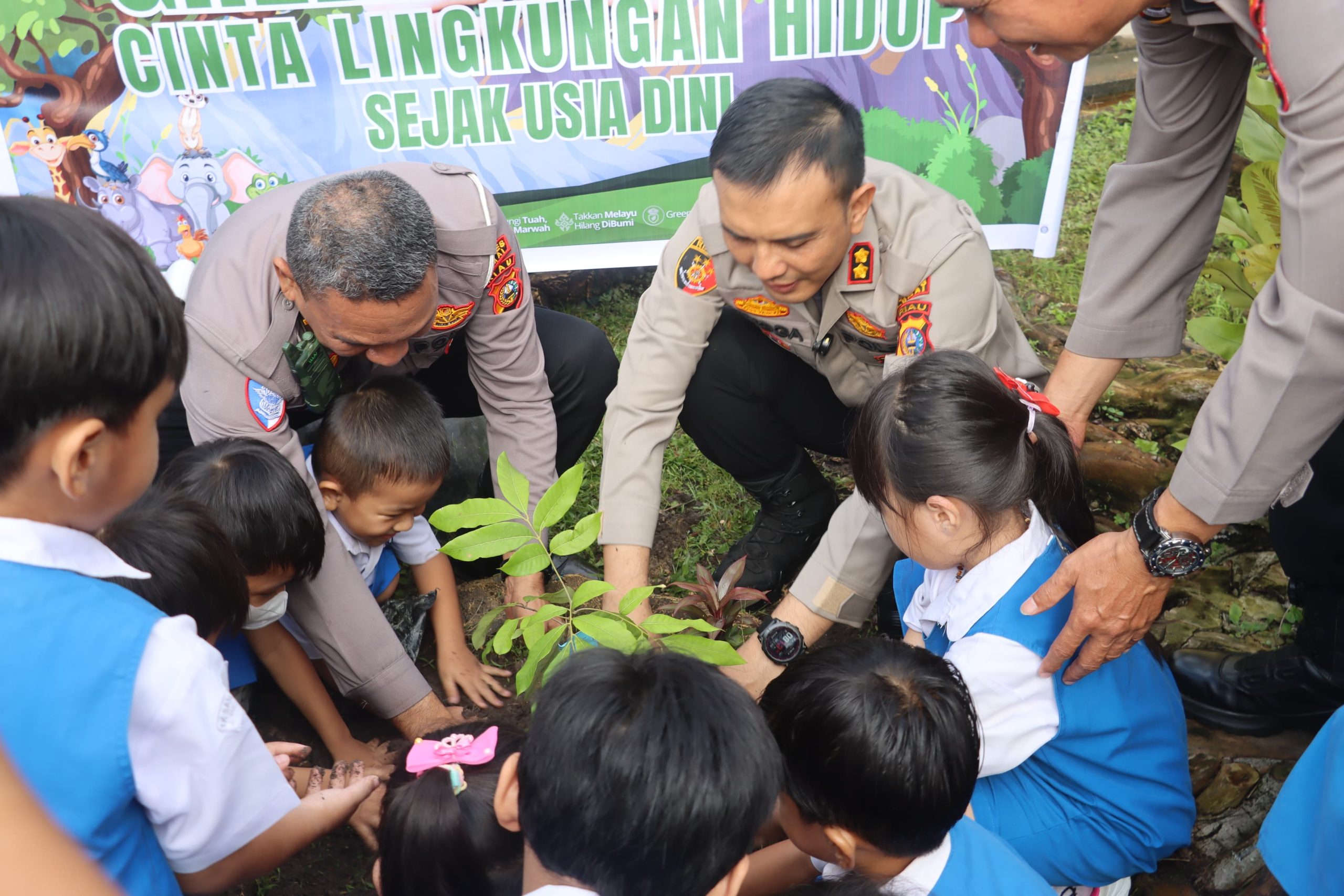 Usai sambutan, Kapolres Dumai bersama para murid melakukan penanaman pohon. Menariknya, kegiatan dilanjutkan dengan aksi cuci tangan bersama, yang sekaligus mengajarkan kebiasaan hidup bersih kepada anak-anak.